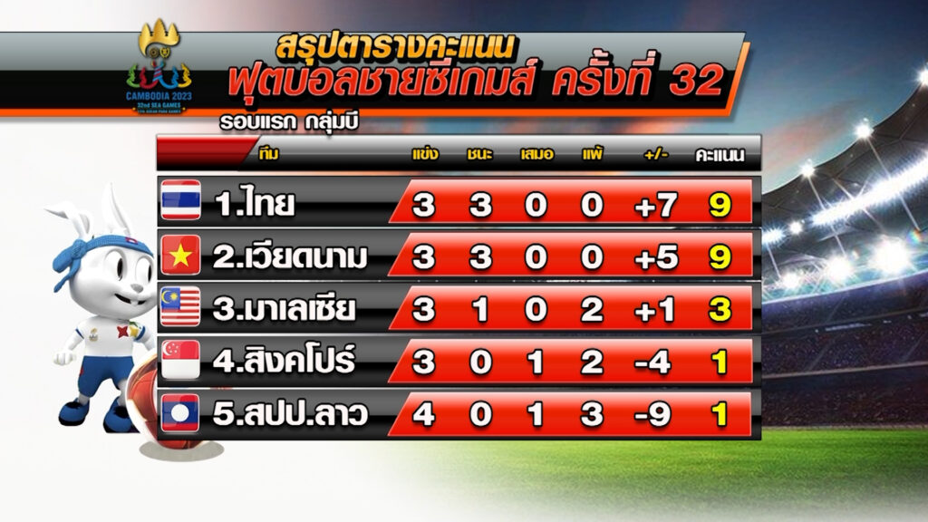 สรุปตารางคะแนนกลุ่มบี. อันดับ 1.ไทย แข่ง 3 นัด มี 9 คะแนน อันดับ 2 เวียดนาม 3 นัด มี 9 อันดับ 3.มาเลเซีย 3 นัด มี 3 คะแนน อันดับ 4.สิงคโปร์ 3 นัดมี 1 คะแนน อันดับ 5. สปป ลาว เตะ 4 นัด มี 1 คะแนน ตกรอบแรก โปรแกรมนัดต่อไปทีมไทย จะพบกับ เวียดนาม วันที่ 11 พฤษภาคม เวลา 19.00 น. ที่สนามปรินซ์ สเตเดียม ช่อง 9 กด 30 ถ่ายทอดสดให้ชม