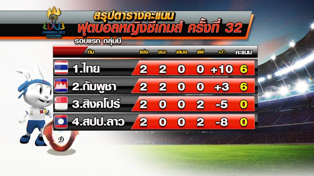 สรุปตารางคะแนน ทีมไทย แข่ง 2 นัด มี 6 คะแนนเท่ากับ กัมพูชา แต่ประตูได้ทีมไทยดีกว่า อันดับ 3 สิงคโปร์ ยังไม่มีคะแนนเช่นเดียวกับอันดับ 4 สปป ลาว สำหรับโปรแกรม ทีมสาวไทย พบกับ กัมพูชา ที่สมาร์ต อาร์เอสเอ็น สเตเดียม วันนี้ เวลา 19.00 น.