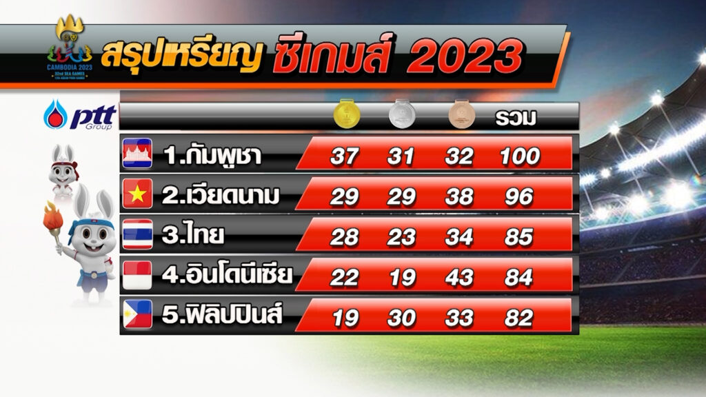 สรุปเหรียญทองล่าสุด อันดับ 1 กัมพูชา 37 เหรียญทอง อันดับ 2 เวียดนาม 29 เหรียญทอง และอันดับ 3 ทีมชาติไทย 28 เหรียญทอง 23 เหรียญเงิน 34 เหรียญทองแดง .-สำนักข่าวไทย