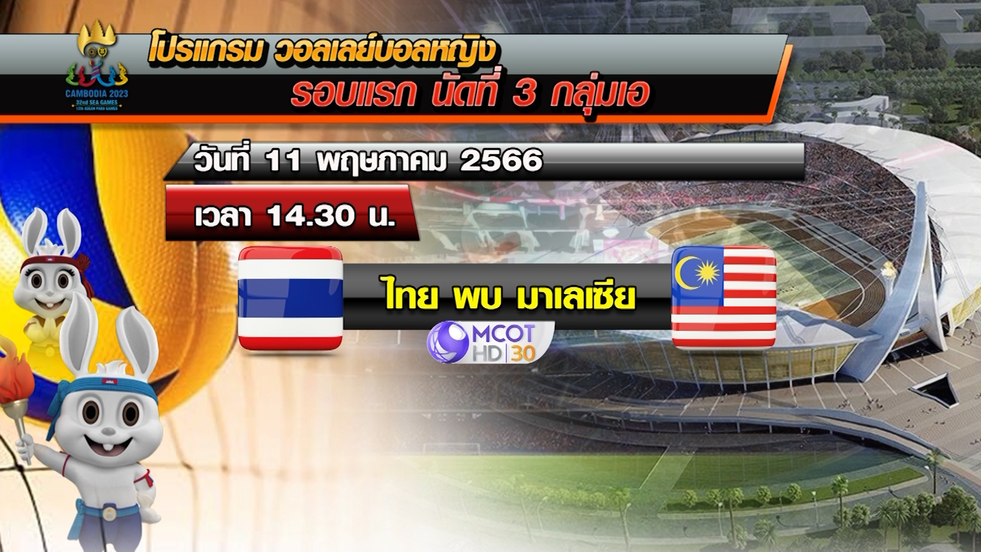 กัมพูชา 11 พ.ค.- ช่วงเชียร์ไทยสุดใจ สู่เจ้าเหรียญทองซีเกมส์ 2023 วันนี้ ส่งกำลังใจเชียร์ทัพนักตบลูกยางสาวไทย จะพบกับมาเลเซีย เวลา 14.30 น. ช่อง 9 กด 30 ถ่ายทอดสด
