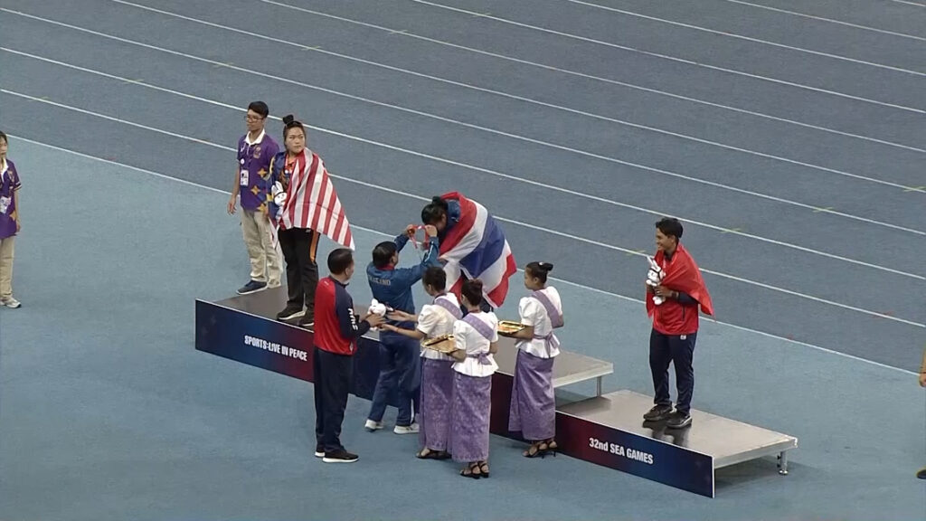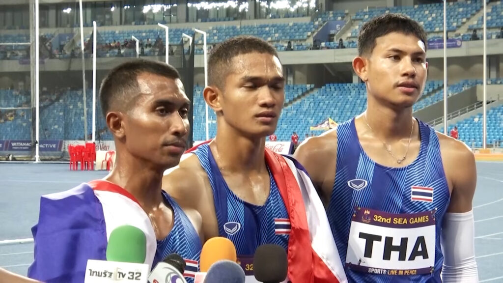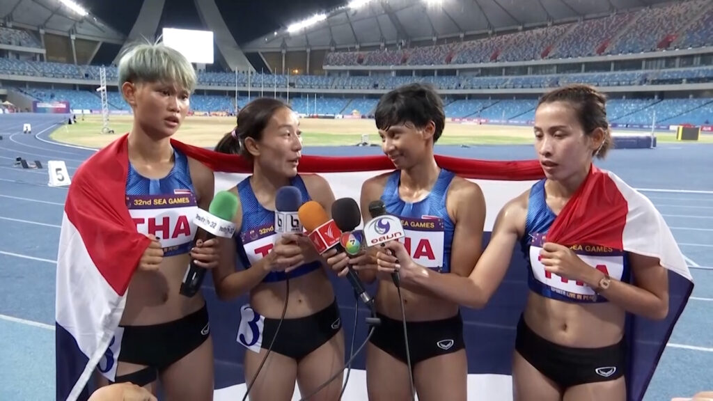 กรีฑาเมื่อวานนี้ไฮไลทต์อยู่ที่การชิงเจ้าลมกรดของอาเซียน วิ่งผลัด 4×100 เมตรชายและหญิง โดย 4×100 เมตรหญิงทีมไทยแชมป์เก่าที่ใช้ชุดเดียวกับที่คว้าแชมป์ที่เวียดนาม ประกอบด้วย ไม้1 สุภาวรรณ ธิปัตย์ ไม้2 ศุภานิช พูลเกิด ไม้3 อรอุมา เชษฐา และไม้4 “ไอซ์” อธิชา เพ็ชรกุล ผลปรากฏว่าทีมลมกรดสาวไทย รับไม้ได้อย่างยอดเยี่ยม โดย “ไอซ์” อธิชา เพ็ชรกุล ไม้สุดท้ายที่แม้จะมีอาการบาดเจ็บเล็กน้อย แต่ยังฮึดสปรินต์วิ่งเข้าเส้นชัยทีมแรก 44.24 วินาที ป้องกันแชมป์ได้สำเร็จและทำเวลาดีกว่าซีเกมส์ครั้งที่แล้ว เหรียญเงิน เวียดนาม 44.51 วินาที เหรียญทองแดง มาเลเซีย 44.58 วินาที ซึ่งหลังป้องกันแชมป์ได้สำเร็จทีมลมกรดสาวไทย บอกว่าดีใจที่ทำได้และขอบคุณทุกกำลังใจทั้งในสนามและที่ประเทศไทย