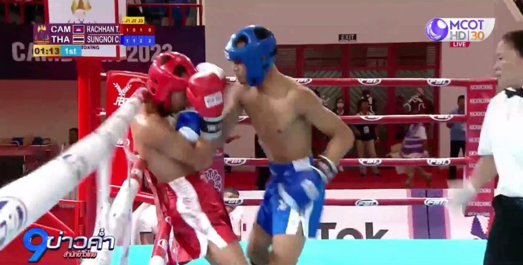 ส่วนรุ่น 57 กิโลกรัมชาย รอบรองชนะเลิศ ไชยวัฒน์ สังข์น้อย นักชาวไทย ฝ่ายน้ำเงิน พบกับ ตูจ ราชาน นักชกเจ้าภาพอีกราย ซึ่งการชกทั้ง 3 ยก นักชกไทยพยายามเตะต่อยทำคะแนน ครบ 3 ยก เป็นนักชกกัมพูชา ที่เอาชนะไปได้ 2-1 คะแนน ทำให้ไชยวัฒน์ นักชกไทยพ่ายไป ส่วนนักชกกัมพูชาเข้าไปชิงเหรียญทองอีกเหรียญ .-สำนักข่าวไทย