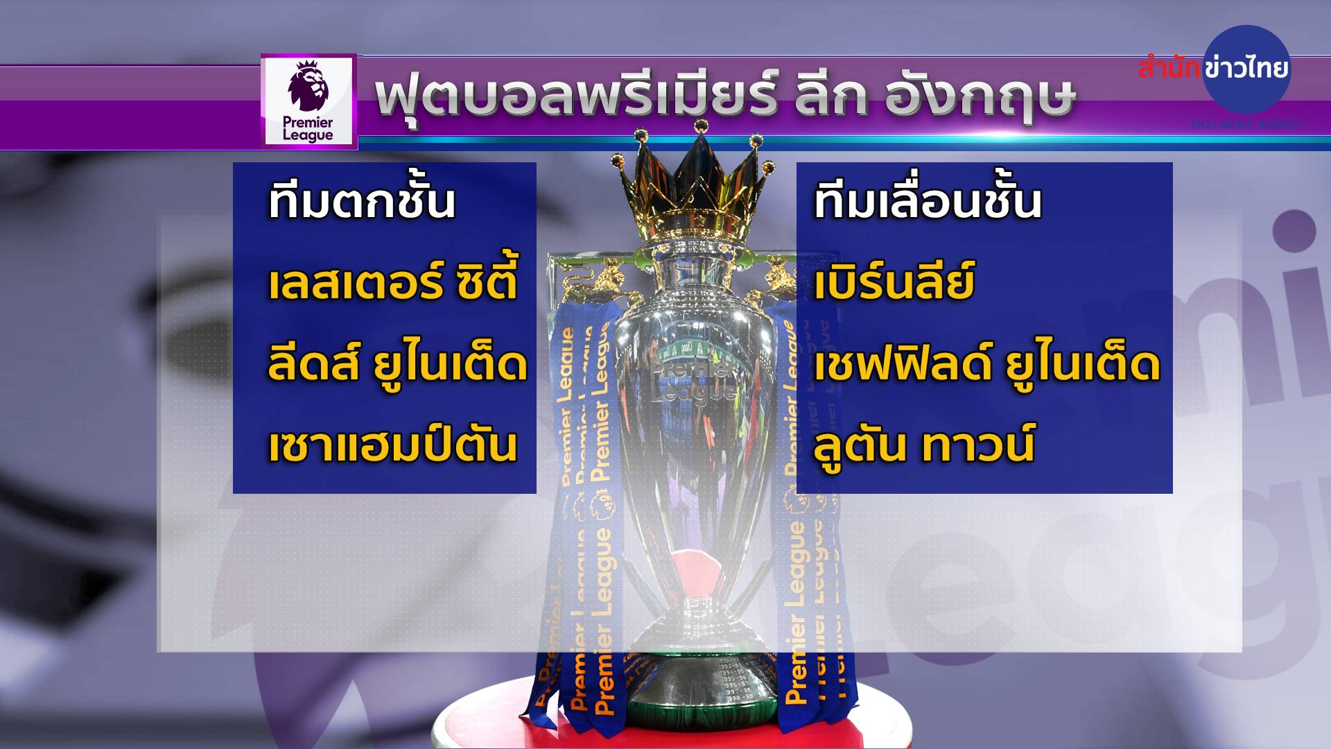 ส่วน 3 ทีมตกชั้น เลสเตอร์ ซิตี้, ลีดส์ ยูไนเต็ด และเซาแฮมป์ตัน ทีมเลื่อนชั้น : เบิร์นลีย์ , เชฟฟิลด์ ยูไนเต็ด, ลูตัน ทาวน์.-สำนักข่าวไทย