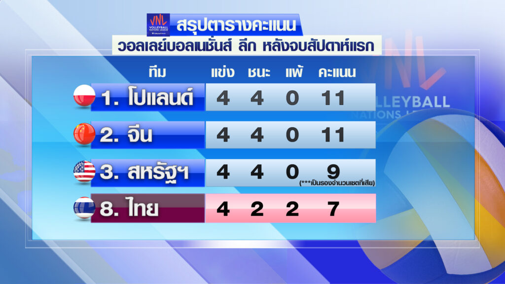 สำหรับสถาการณ์หลังจบจากสัปดาห์แรก ทีมโปแลนด์นำเป็นอันดับ 1 แข่ง 4 นัด ชนะ 4 นัด มี 11 คะแนน ตามาด้วยจีน แข่ง 4 ชนะ 4 มี 11 คะแนนเช่นกัน โดยสหรัฐ ตามมาเป็นอันดับ 3 แข่ง 4 นัด ชนะ 4 ยังไม่แพ้ใครเช่นกัน แต่เป็นรองการเสียเซตทำให้มี 9 คะแนน 9 ส่วน ทีมสาวไทยรั้งอันดับ 8 แข่ง 4 นัด ชนะ 2 มี 7 คะแนน