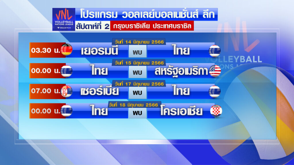 ส่วนโปรแกรมสัปดาห์ที่สอง นัดแรกวันที่ 14 มิถุนายน เวลา 03.30 น. ทีมสาวไทย พบ เยอรมนี นัดที่สอง วันที่ 15 มิถุนายน เวลาเที่ยงคืน ทีมสาวไทย พบ สหรัฐอเมริกา นัดที่สาม วันที่ 17 มิถุนายน เวลา 07.00 น. ทีมสาวไทย พบ เซอร์เบีย และวันที่ 18 มิถุนายน เวลา เที่ยงคืน ทีมสาวไทย พบกับ โครเอเชีย .-สำนักข่าวไทย