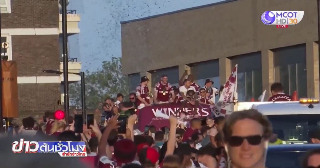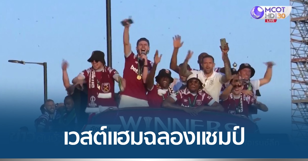 อังกฤษ 9 มิ.ย. – นักเตะเวสต์แฮม ขึ้นรถบัสฉลองแชมป์ ยูโรป้า คอนเฟอเรนซ์ลีก ตามถนนทางตะวันออกของกรุงลอนดอน แฟนบอลร่วมแสดงความยินดี