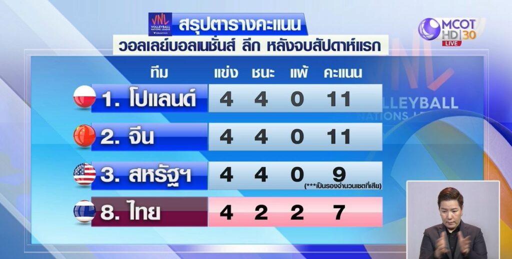 สำหรับสถาการณ์หลังจบจากสัปดาห์แรก ทีมโปแลนด์นำเป็นอันดับ 1 แข่ง 4 นัด ชนะ 4 นัด มี 11 คะแนน ส่วน ทีมสาวไทยรั้งอันดับ 8 แข่ง 4 นัด ชนะ 2 มี 7 คะแนน เก็บเงินรางวัลจากสนามแรก มาได้ 900,000 บาท