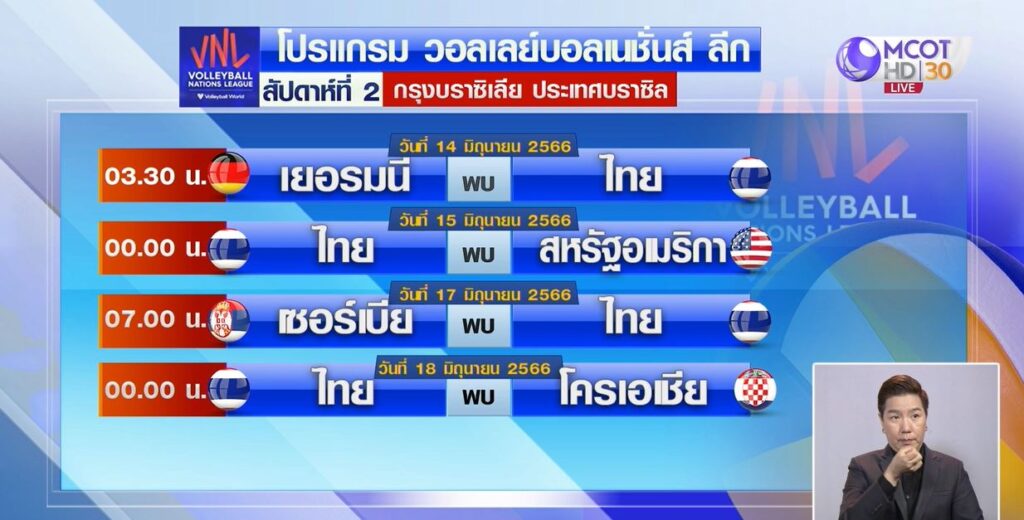 ส่วน โปรแกรมสัปดาห์ที่สอง นัดแรกวันที่ 14 มิถุนายน เวลา 03.30 น. ทีมไทย พบ เยอรมนี นัดที่สอง วันที่ 15 มิถุนายน เวลาเที่ยงคืน ทีมไทย พบ สหรัฐอเมริกา นัดที่สาม วันที่ 17 มิถุนายน เวลา 07.00 น. ทีมไทย พบ เซอร์เบีย และวันที่ 18 มิถุนายน เวลาเที่ยงคืนทีมสาวไทย พบกับ โครเอเชีย .-สำนักข่าวไทย