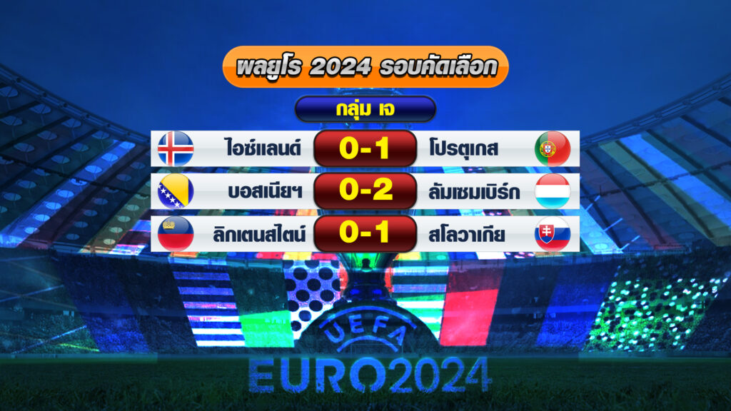 ผลฟุตบอลยูโร 2024 รอบคัดเลือก กลุ่ม เจ ไอซ์แลนด์ แพ้ โปรตุเกส 0-1 โดยทีมฝอยทอง โปรตุเกส มาได้ประตูชัยจาก คริสเตียโน่ โรนัลโด้ นาทีที่ 89 ซึ่งถือเป็นประตูที่ 123 สูงสุดในนามทีมชาติ พร้อมสร้างสถิติเป็นนักฟุตบอลชายคนแรกในประวัติศาสตร์ที่ติดทีมชาติถึง 200 นัด บอสเนียฯ แพ้ ลัมเซมเบิร์ก 0-2 ลิกเตนสไตน์ แพ้ สโลวาเกีย 0-1 กลุ่มนี้ โปรตุเกส นำจ่าฝูง มี 12 คะแนนเต็ม จากการเก็บชัยชนะ 4 นัดรวด อันดับ 2 สโลวาเกีย มี 10 คะแนน