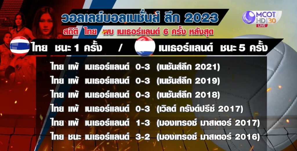 สำหรับ สถิติ ไทย พบ เนเธอร์แลนด์ 6 ครั้ง หลังสุด ไทยชนะ 1 ครั้ง เนเธอร์แลนด์ ชนะ 5 ครั้ง โดย 5 ครั้งหลังสุด ไทย แพ้ รวด ซึ่งครั้งล่าสุดที่พบกัน ในศึกเนชันส์ลีก 2021 ไทย แพ้ เนเธอร์แลนด์ 0-3 ส่วนครั้งล่าสุดที่ไทย เอาชนะเนเธอร์แลนด์ได้ ต้องย้อนไปปี 2016 ในศึกมองเทรอซ์ มาสเตอร์ ตอนนั้น ไทย เอาชนะ ไปได้ 3-2 เซต .-สำนักข่าวไทย