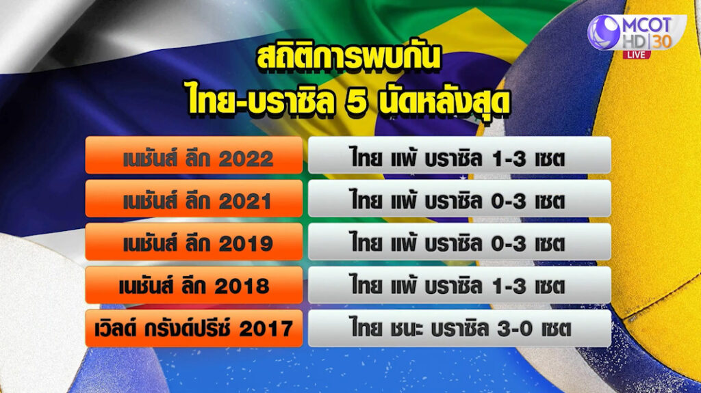 สำหรับสถิติไทย กับบราซิล 5 ครั้งหลัง ทีมไทย แพ้ 4 ครั้ง ล่าสุดในศึก เนชันส์ ลีกส์ ทั้ง 4 ครั้ง สาวไทยแพ้รวด ได้มา 2 เซต ส่วนเมื่อปี 2017 ไทยชนะบราซิลได้ 1 ครั้ง 3-0 เซต ในศึกวอลเลย์บอลเวิลด์กรังด์ปรีซ์