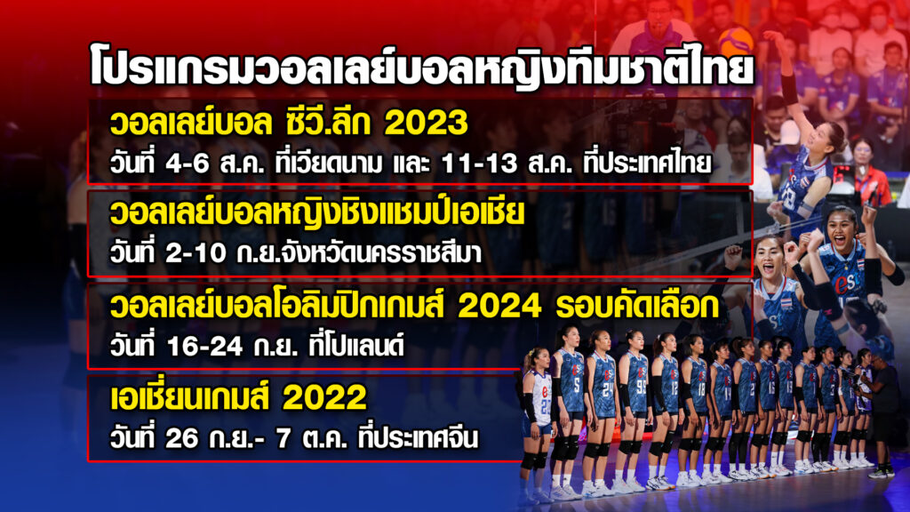 สำหรับโปรแกรมวอลเลย์บอลหญิงทีมชาติไทย หลังจากนี้ จะเริ่มที่วอลเลย์บอล ซีวี.ลีก 2023 วันที่ 4-6 ส.ค. ที่เวียดนาม และ11-13 ส.ค. ที่ประเทศไทย ต่อด้วยวอลเลย์บอลหญิงชิงแชมป์เอเชีย