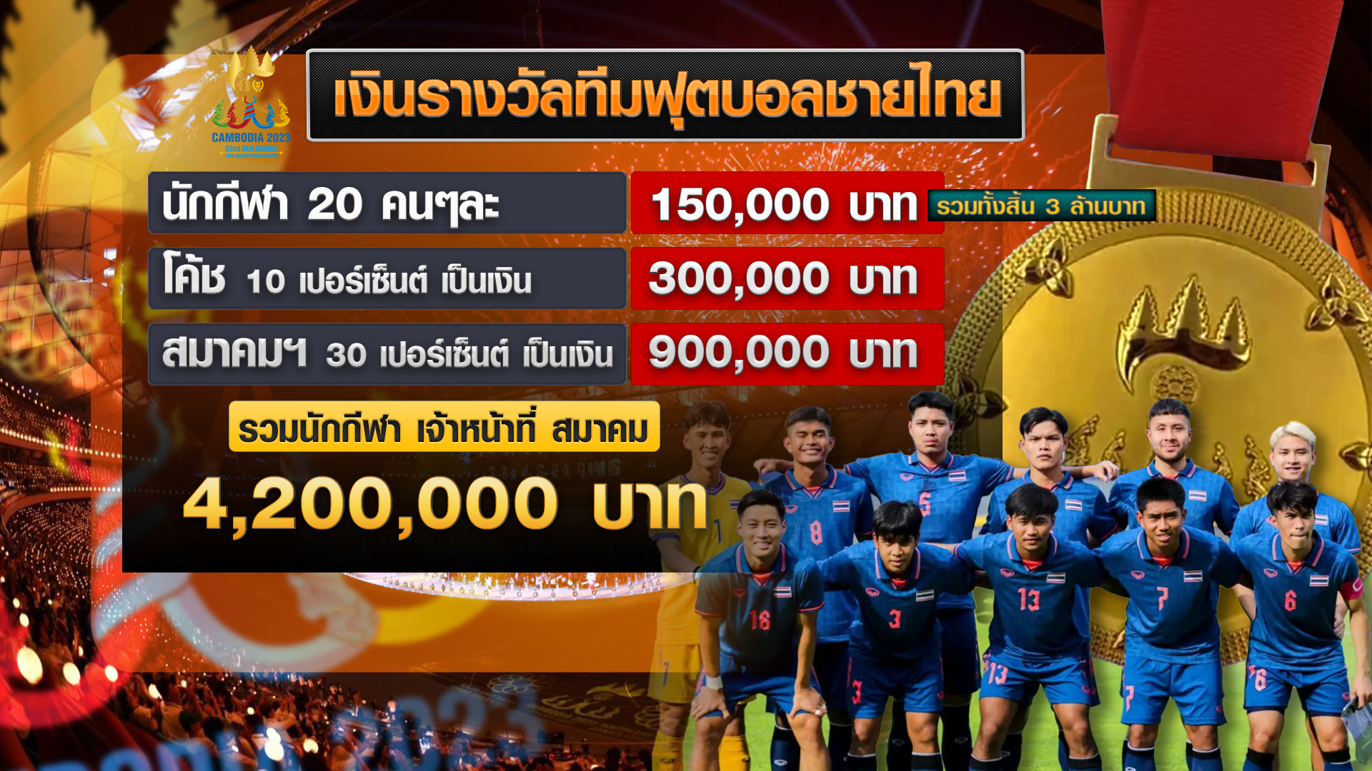 สำหรับทีมฟุตบอลชายไทย จะได้รับเงินอัดฉีด 3 ล้านบาท จากนักกีฬา 20 คน ส่วนโค้ช 10% เป็นเงิน 300,000 บาท และสมาคมฯ 30% เป็นเงิน 900,000 บาท รวมนักกีฬา เจ้าหน้าที่ และสมาคมฯ เป็นเงิน 4.2 ล้านบาท