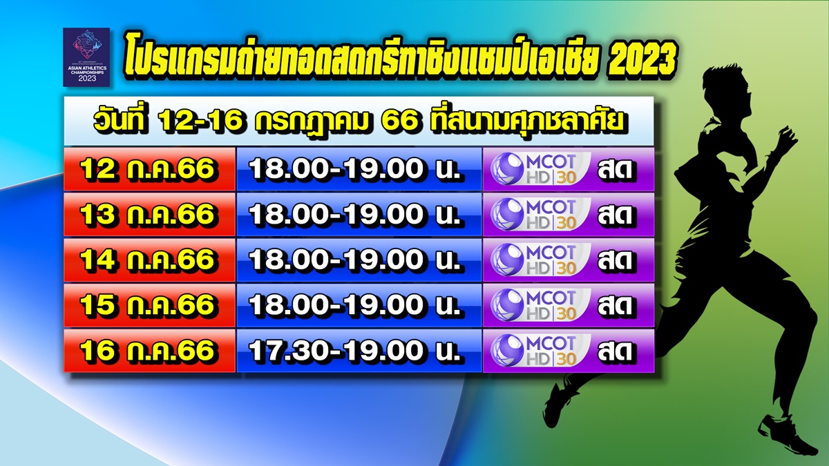 นายผาติยุทธ ใจสว่าง รักษาการในตำแหน่งผู้อำนวยการใหญ่ บริษัท อสมท จำกัด (มหาชน) เปิดเผยถึงความพร้อมในการถ่ายทอดสดการแข่งขันกรีฑาชิงแชมป์เอเชีย ครั้งที่ 25 ระหว่างวันที่ 12-16 กรกฎาคมนี้ ที่สนามศุภชลาศัย สนามกีฬาแห่งชาติ ซึ่งช่อง 9 MCOT HD กด 30 มีส่วนร่วมในการถ่ายทอดสดครั้งนี้ โดยบอกว่า รู้สึกเป็นเกียรติอย่างยิ่งที่ทางสมาคมกีฬากรีฑาแห่งประเทศไทยฯ ให้ช่อง 9 ถ่ายทอดสดให้แฟนกีฬาชาวไทยและทั่วเอเชียได้รับชมถึงบ้านแบบ HD คมชัดเหมือนนั่งชมในสนามทุกวัน ตั้งแต่วันที่ 12-16 กรกฎาคมนี้