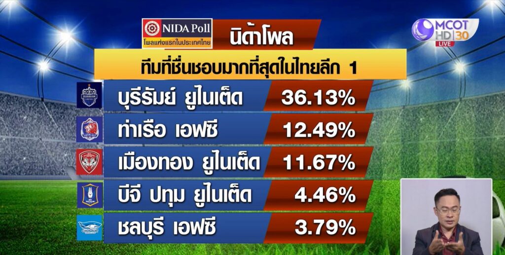 เมื่อถามถึงทีมที่ชื่นชอบมากที่สุดในการแข่งขันฟุตบอลไทยลีก 1 ในฤดูกาล 2566-2567 พบว่า ผู้ที่ติดตามฟุตบอลไทยลีก 1 (1,345 หน่วยตัวอย่าง) อันดับ 1 ร้อยละ 36.13 ระบุว่า ทีมบุรีรัมย์ ยูไนเต็ด อับดับ 2 ร้อยละ 12.49 ระบุว่า ทีมการท่าเรือ เอฟซี อับดับ 3 ร้อยละ 11.67 ระบุว่า ทีมเมืองทอง ยูไนเต็ด อันดับ 4 ร้อยละ 4.46 ระบุว่า ทีมบีจี ปทุม ยูไนเต็ด อันดับ 5 ร้อยละ 3.79 ระบุว่า ทีมชลบุรี เอฟซี ร้อยละ 2.97 .-สำนักข่าวไทย.-สำนักข่าวไทย