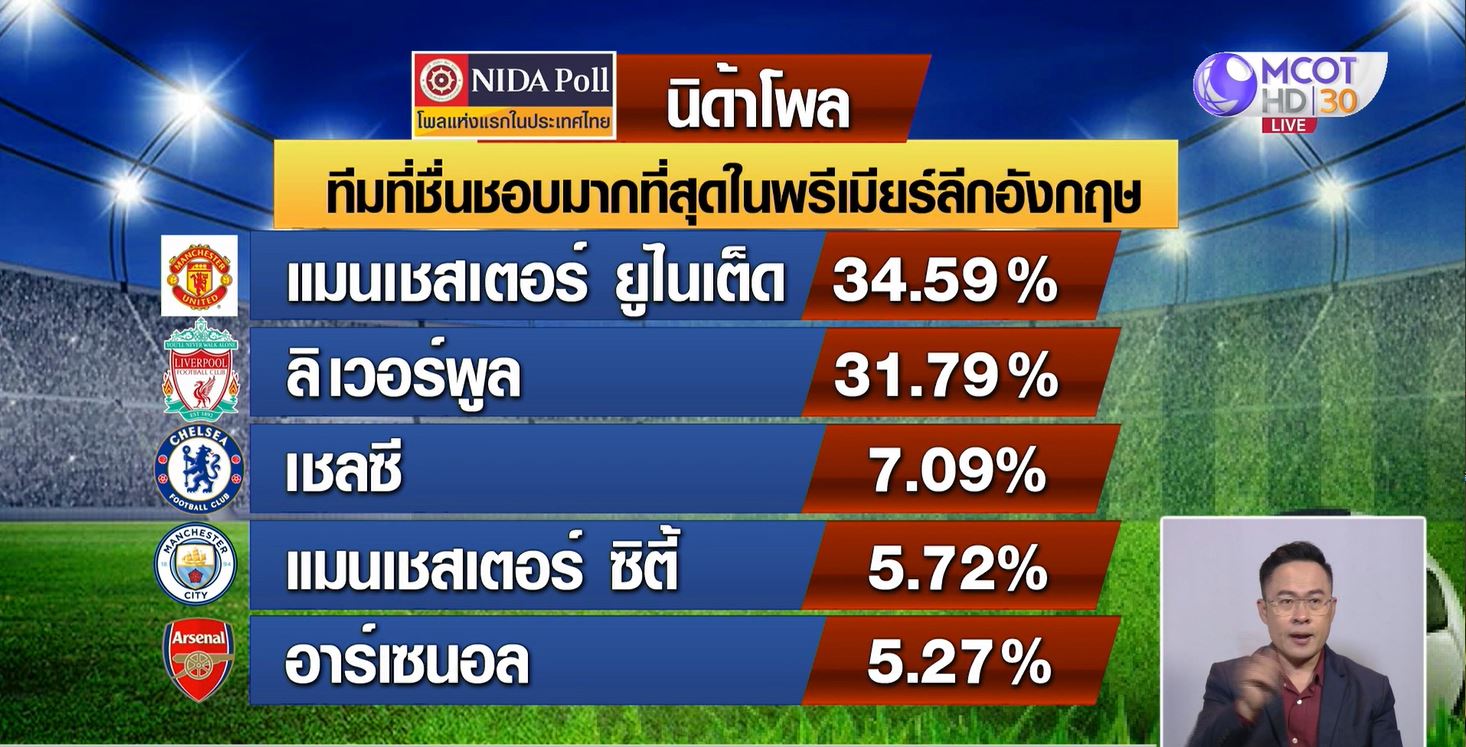 ทีมที่ชื่นชอบมากที่สุดในการแข่งขันฟุตบอลพรีเมียร์ลีกอังกฤษ ในฤดูกาล 2023-2024 พบว่า ผู้ที่ติดตามฟุตบอลพรีเมียร์ลีกอังกฤษ 1,538 หน่วยตัวอย่าง อันดับ 1 ร้อยละ 34.59 แมนเชสเตอร์ ยูไนเต็ด, อันดับ 2 ร้อยละ 31.79 ลิเวอร์พูล, อันดับ 3 ร้อยละ 7.09 เชลซี, อับดับ 4 ร้อยละ 5.72 แมนเชสเตอร์ ซิตี้ และอันดับ 5 ร้อยละ 5.27 อาร์เซนอล