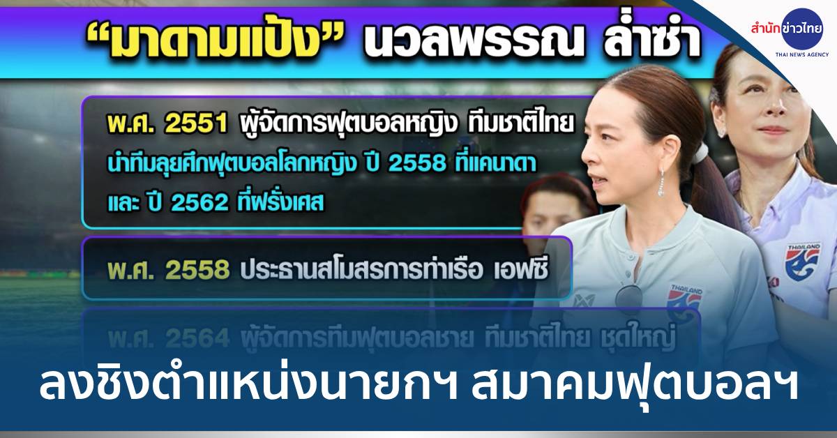กทม. 13 ส.ค.-“มาดามแป้ง” นวลพรรณ ล่ำซำ ประกาศลงชิงตำแหน่งนายกสมาคมกีฬาฟุตบอลแห่งประเทศไทย หลังได้รับการทาบทามจาก พล.ต.อ.สมยศ พุ่มพันธุ์ม่วง นายกสมาคมกีฬาฟุตบอลคนปัจจุบัน ที่จะหมดวาระในเดือนกุมภาพันธ์ ปีหน้า.–สำนักข่าวไทย