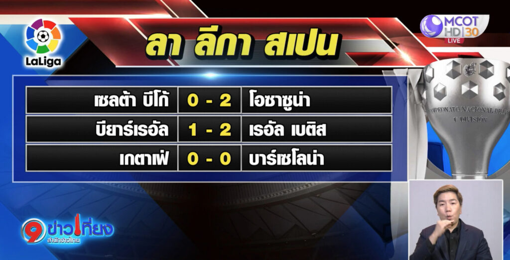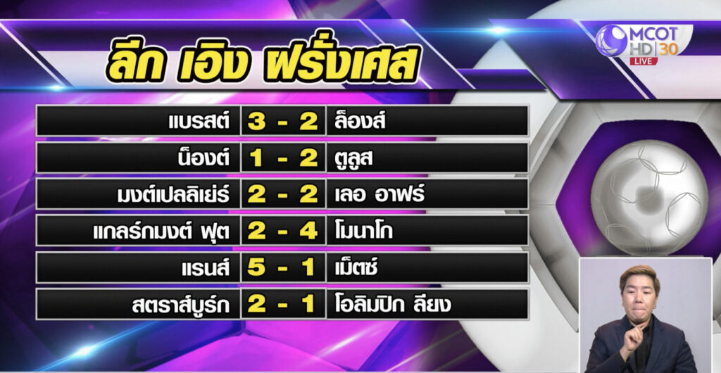 ผลอีกคู่ เบรนท์ฟอร์ด 2-2 สเปอร์ส. ลาลีกา สเปน เซลต้า บีโก้ 0-2 โอซาซูน่า บียาร์เรอัล 1-2 เรอัล เบติส เกตาเฟ่ 0-0 บาร์เซโลน่า ลีกเอิง ฝรั่งเศส แบรสต์ 3-2 ล็องส์ น็องต์ 1-2 ตูลูส มงต์เปลลิเยร์ 2-2 เลอ อาฟร์ แกลร์กมงต์ ฟุต 2-4 โมนาโก แรนส์ 5-1 เม็ตซ์ สตราส์บูร์ก 2-1 โอลิมปิก.–สำนักข่าวไทย