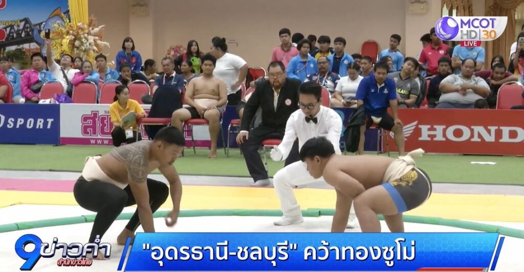 ซูโม่ ที่มหาวิทยาลัยราชภัฏกาญจนบุรี รอบชิงชนะเลศ น้ำหนักมากกว่า 70 กิโลกรัม แต่ไม่เกิน 85 กิโลกรัมชาย ธนวัฒน์ คำหาร เจ้าของแชมป์ประเทศไทย จากอุดรธานี จับ สราวุธ แสงหิรัญ จากชลบุรี ทุ่มหลังเตะพื้น คว้าเหรียญทองไปครอง