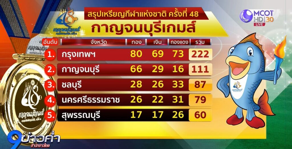 สรุปเหรียญทอง กรุงเทพมหานคร ยังนำเป็นอันดับ 1 ส่วนเจ้าภาพ กาญจนบุรี ตามมาเป็นอันดับ 2 และอันดับ 3 ชลบุรี .-สำนักข่าวไทย