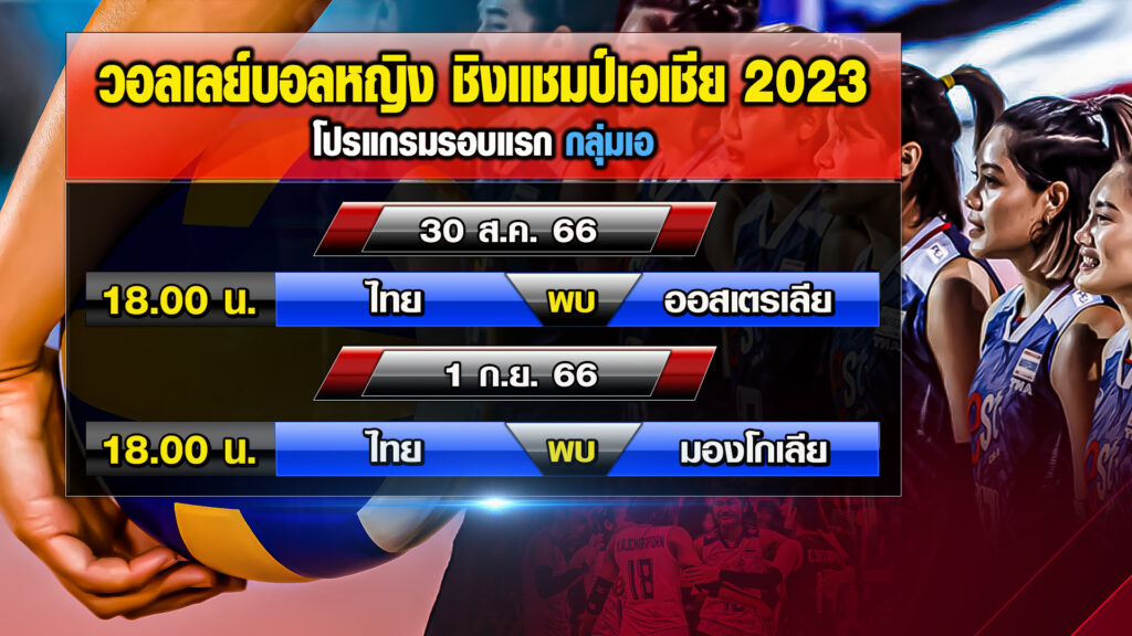 สำหรับโปรแกรมวอลเลย์บอลหญิง ชิงแชมป์เอเชีย 2023 รอบแรก กลุ่มเอ 30 ส.ค. 66 เวลา 18.00 น. ไทย พบ ออสเตรเลีย 1 ก.ย. 66 เวลา 18.00 น. ไทย พบ มองโกเลีย สาวไทยจะแข่งขันที่สนามชาติชาย ฮอลล์