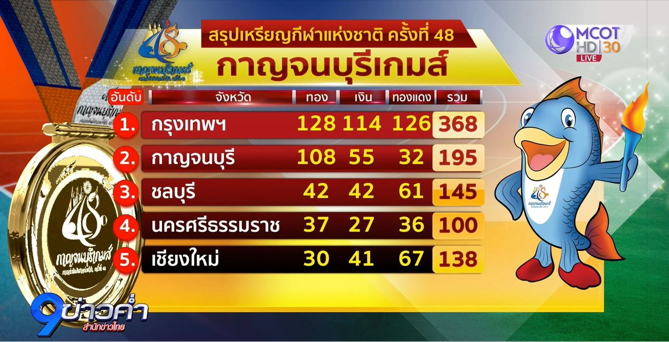 สรุปเหรียญทองกรุงเทพมหานคร ครองเจ้าเหรียญทองอีกสมัย โดยนับเป็นสมัยที่ 30 โดยคว้าไป 128 เหรียญทอง 114 เหรียญเงิน 126 เหรียญทองแดง ด้านเจ้าภาพ กาญจนบุรี จบอันดับที่ 2 หลังคว้า 108 เหรียญทอง 55 เหรียญเงิน 32 เหรียญทองแดง ซึ่งนับเป็นผลงานที่ดีที่สุดในประวัติศาสตร์ของกาญจนบุรีด้วย ส่วนอันดับ 3 ชลบุรี .-สำนักข่าวไทย