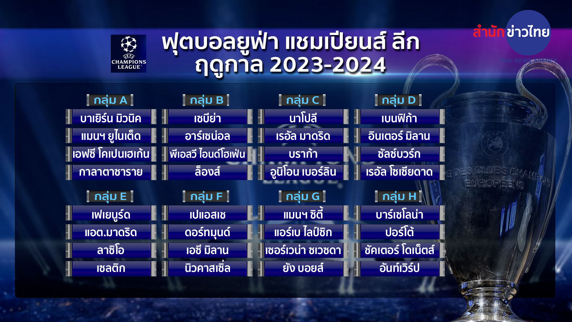 การจับสลากรอบแบ่งกลุ่มยูฟ่า แชมเปียนส์ลีกฤดูกาล 2023-2024 ที่โมนาโก แบ่งเป็น 8 กลุ่มๆ ละ 4 ทีม โดยรอบนี้ทีมจากประเทศเดียวกันยังไม่พบกัน ผลปรากฏว่า