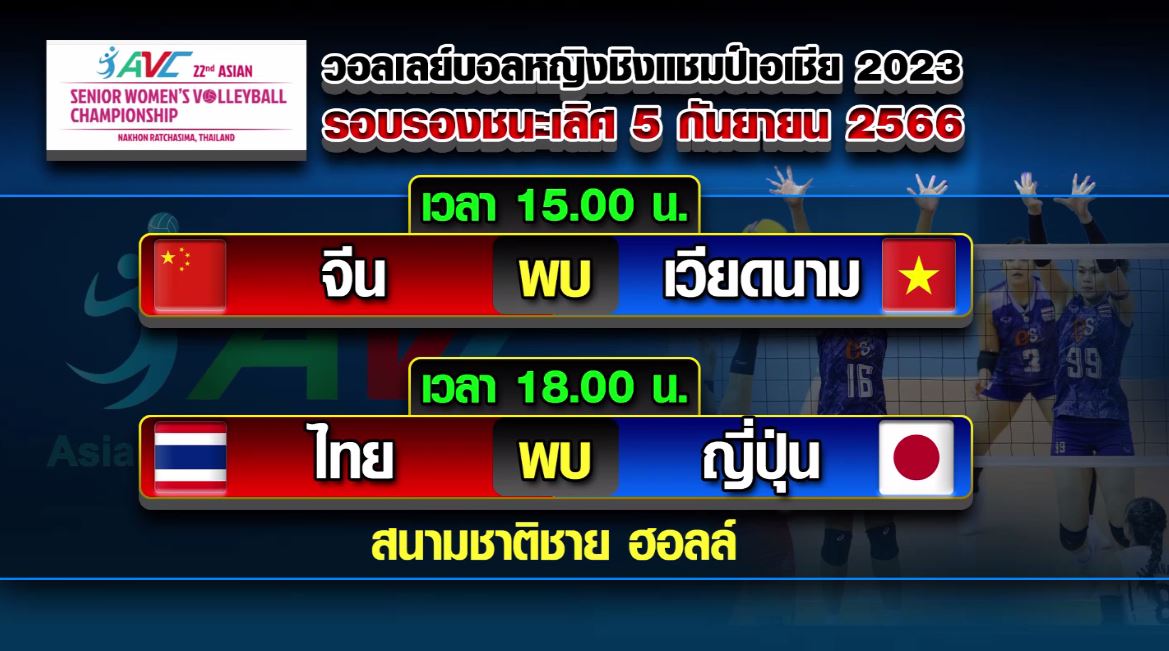 สำหรับทีมชาติไทย แชมป์กลุ่มอี จะลงสนามรอบรองชนะเลิศ พบกับ ญี่ปุ่น อันดับ 2 กลุ่มเอฟ เวลา 18.00 น. วันพรุ่งนี้ (5 ก.ย.66) ที่ชาติชาย ฮอลล์ ส่วน เวียดนาม อันดับ 2 กลุ่มอี จะพบกับ ทีมชาติจีน แชมป์กลุ่มเอฟ เวลา 15.00 น. – สำนักข่าวไทย