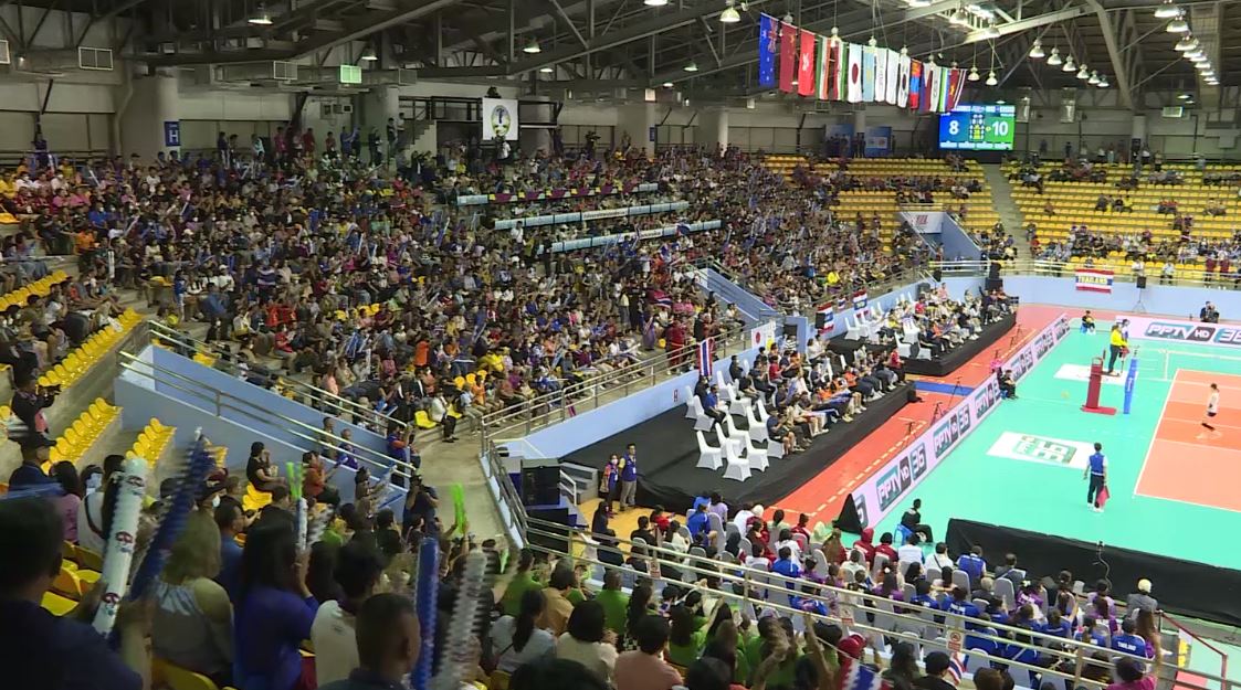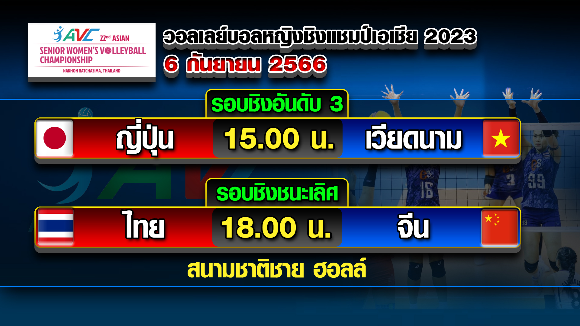 บรรยากาศก่อนเกม วอลเลย์บอลหญิงชิงแชมป์เอเชีย ครั้งที่ 22 ประจำปี 2566 ที่โคราช ชาติชาย ฮอลล์ รอบรองชนะเลิศ นักตบลูกยางสาวไทย ดีกรีแชมป์เอเชีย 2 สมัย ปี 2009 และปี 2013 ทีมอันดับที่ 14 ของโลก พบกับ ญี่ปุ่น แชมป์เก่า และแชมป์ 5 สมัย ทีมอันดับ 8 ของโลก บรรดาแฟนวอลเลย์บอลชาวโคราชและจังหวัดใกล้เคียงยังคงสร้างสีสัน เดินทางมาชมการแข่งขัน ให้กำลังใจเชียร์ทีมสาวไทยจำนวนมาก เกือบเต็มความจุของสนาม 5,000 ที่นั่ง