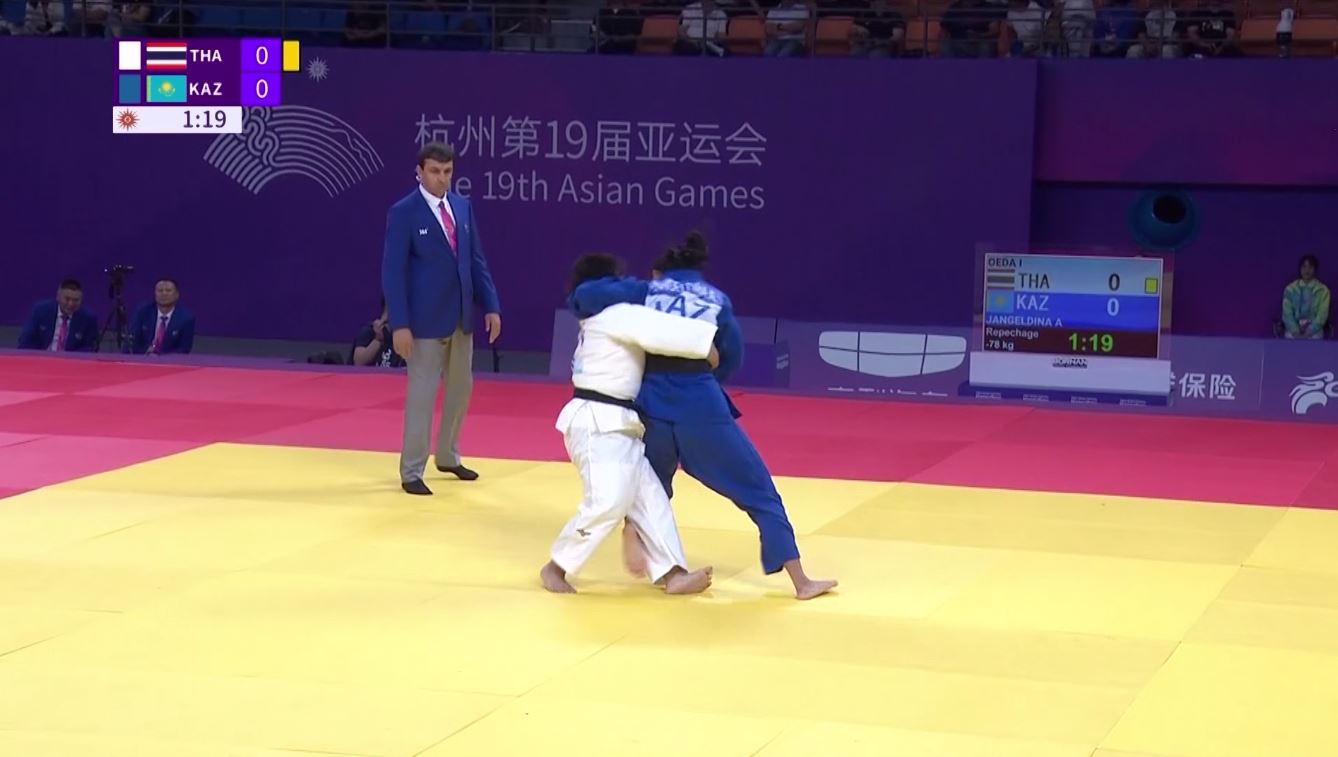 การแข่งขันยูโด ในมหกรรมเอเชียนเกมส์ 2022 ที่เอ็กซ์เอส แอล ยิมเนเซียม เมืองหางโจว ประเทศจีน รอบรีเปอร์ชาร์ต ลุ้นชิงเหรียญทองแดง รุ่นน้ำหนักไม่เกิน 78 กิโลกรัมหญิง อิคุมิ โอเอดะ นักกีฬาลูกครึ่งไทย-ญี่ปุ่น เจ้าของเหรียญทองแดงรุ่นนี้จากครั้งก่อน พบกับ อารูนา แจนเจลดินา จากคาซัคสถาน ผลปรากฏว่า โอเอดะ พยายามสู้อย่างเต็มที่ แต่แพ้นักกีฬาคาซัคสถาน พลาดโอกาสคว้าเหรียญทองแดงไปอย่างน่าเสียดาย. – สำนักข่าวไทย