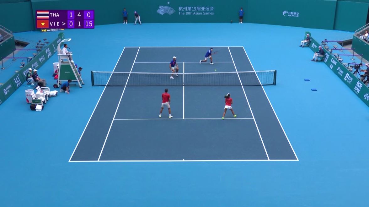 การแข่งขันเทนนิส ในมหกรรมเอเชียนเกมส์ ครั้งที่ 19 ที่สนามโอลิมปิกเทนนิส เซ็นเตอร์ เมืองหางโจว ประเทศจีน ประเภทคู่ผสม รอบ 32 คู่ ลักษิกา คำขำ เจ้าของเหรียญเงิน ประเภทคู่ผสม กีฬาเอเชียนเกมส์ ครั้งที่ 18 จับคู่กับ “แม็กซ์” แม็กซิมัส ภราพล โจนส์ ลูกครึ่งไทย-ออสเตรเลีย เป็นคู่มือวาง 11 ของรายการ เสื้อสีน้ำเงิน ช่วยกันหวดเอาชนะ ลี เหวียน สวันนา และ เหวียน เฟือง วัน จากเวียดนาม 2-0 เซต 6-4, 6-1 ผ่านเข้ารอบ 3 หรือรอบ 16 คู่สุดท้าย. – สำนักข่าวไทย
