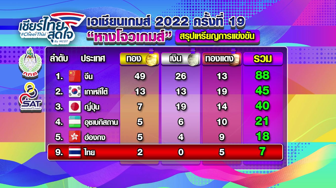สรุปเหรียญทองล่าสุด จีน เจ้าภาพ ยังนำเป็นอันดับ 1 คว้าไป 49 เหรียญทอง 26 เหรียญเงิน 13 เหรียญทองแดง อันดับ 2 เกาหลีใต้ 13 เหรียญทอง 13 เหรียญเงิน 19 เหรียญทองแดง อันดับ 3 ญี่ปุ่น 7 เหรียญทอง 19 เหรียญเงิน 14 เหรียญทองแดง ส่วนไทย ขยับขึ้นมาอยู่อันดับ 9 คว้า 2 เหรียญทอง 5 เหรียญทองแดง