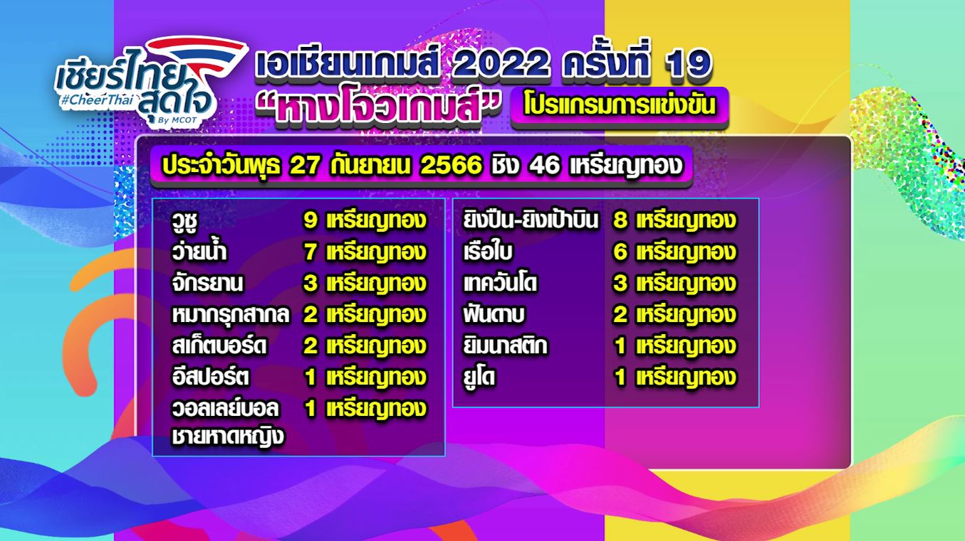 ส่วนโปรแกรมเอเชียนเกมส์ วันพรุ่งนี้ (27 ก.ย.66) ชิง 46 เหรียญทอง วูซู 9 เหรียญทอง, ยิงปืน-ยิงเป้าบิน 8 เหรียญทอง, ว่ายน้ำ 7 เหรียญทอง, เรือใบ 6 เหรียญทอง, จักรยาน-เทควันโด 3 เหรียญทอง, หมากรุกสากล-ฟันดาบ-สเก็ตบอร์ด 2 เหรียญทอง, ยิมนาสติก-อีสปอร์ต-ยูโด-วอลเลย์บอลชายหาดหญิง ชิง 1 เหรียญทอง. – สำนักข่าวไทย