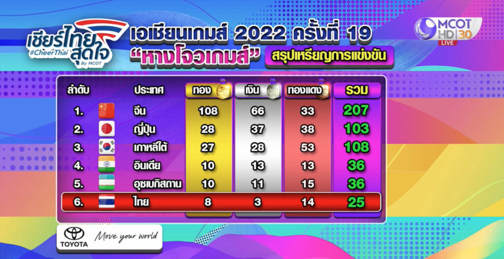 ด้านการแข่งขันกีฬาอีสปอร์ตที่ไชน่า หางโจว อีสปอร์ต เซ็นเตอร์ รอบชิงเหรียญทองแดงในเกม ดรีม ทรี คิงดอม ทู ทัพอีสปอร์ตไทย ที่ประกอบด้วย วีฤทธิ์ โพธิ์พันธุ์ พชร ทองเอี่ยม ชัชพล จันทร ธีรภัทร์ สุภอัศม์เดช วรัญชัย สุกรินทร์ และอรรถกฤษ สมรรถกิจวณิช เอาชนะ เวียดนาม 2-0 เกม คว้าเหรียญทองแดงไปครอง ทำให้ตอนนี้ทีมอีสปอร์ตไทยคว้าไปแล้ว 1 เหรียญทอง 1 เหรียญเงิน และอีก 2 เหรียญทองแดง