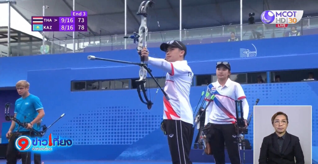 ด้าน ยิงธนู ที่ฟู่หยาง อิ๋นหู สปอร์ต เซ็นเตอร์ ประเภทคันธนูทดกำลัง (คอมปาวด์) ทีมผสม รอบ 8 ทีมสุดท้าย ทีมชาติไทย ที่ส่ง สิรภพ ไชยนาค กับ กัณยาวีธ์ มณีสมบัติกุล เสื้อสีขาว-น้ำเงิน ลงสนามพบกับ อเดล เซกเซนบิโนวา กับ อันเดรย์ ตูทวน จากคาซัคสถาน ปรากฏว่าคู่นี้ยิงกันได้สูสีก่อนที่ทีมไทยจะแพ้ไปฉิวเฉียด หลังรวม 4 ชุด 152-154 คะแนน ทำให้คู่ของไทยตกรอบไปอย่างน่าเสียดาย ส่วน คาซัคสถาน เข้ารอบรองชนะเลิศไปพบกับ อินเดีย.-สำนักข่าวไทย