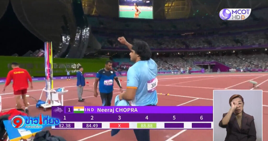 ส่วน นีรา โชปร้า นักพุ่งแหลนอินเดีย แชมป์โอลิมปิกครั้งล่าสุดเช่นกัน ไม่พลาดคว้าเหรีญญทองที่สถิติ 88.88 เมตร เฉือนชนะ คิชอร์ คูมาร์ เพือนร่วมชาติที่ได้เหรียญเงิน ที่ 87.54 เมตรไปนิดเดียว.-สำนักข่าวไทย