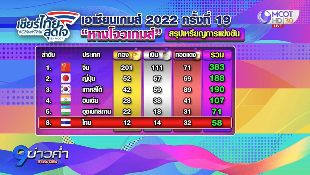 ทัพนักกีฬาไทยคว้ามาได้รวม 58 เหรียญ ได้รับเงินรางวัลจากกองทุพนพัฒนากีฬาแห่งชาติ รวม 244 ล้าน 2 แสนบาท แบ่งเป็นเหรียญทอง เหรียญละ 2 ล้านบาท เหรียญเงิน 1 ล้านบาท เหรียญทองแดง 5 แสนบาท และโค้ชได้รับเงินผู้ฝึกสอน 20 เปอร์เซ็นต์ และสมาคมที่ได้รับเหรียญรางวัล 22 สมาคมจะได้รับอีกสมาคมละ 30 เปอร์เซ็นต์.– – สำนักข่าวไทย