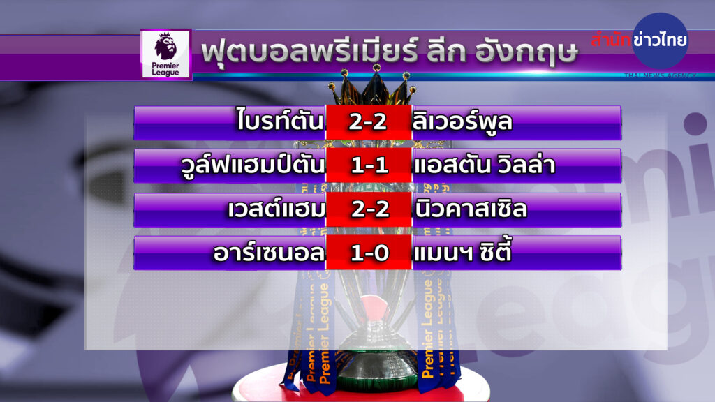 ส่วนผลคู่อื่น ไบรท์ตัน เสมอ ลิเวอร์พูล 2-2, วูล์ฟแฮมป์ตัน เสมอ แอสตัน วิลลา 1-1 และ เวสต์แฮม เสมอ นิวคาสเซิล 2-2