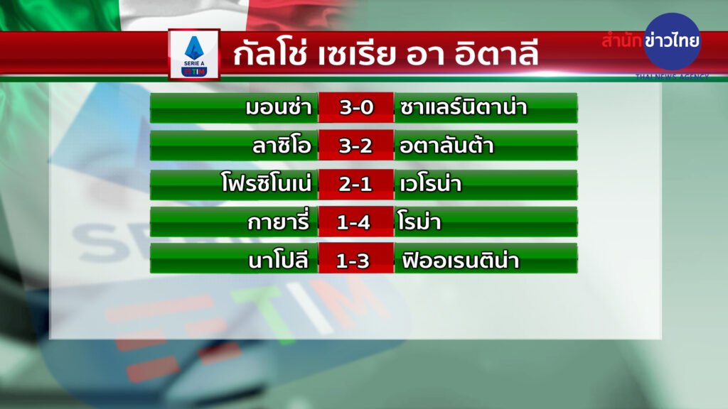 กัลโช เซเรีย อา อิตาลี มอนซา ชนะ ซาแลร์นิตานา 3-0, ลาซิโอ ชนะ อตาลันต้า 3-2, โฟรซิโนเน ชนะ เวโรนา 2-1, กายารี แพ้ โรมา 1-4 และ นาโปลี แพ้ ฟิออเรนตินา 1-3 .-สำนักข่าวไทย