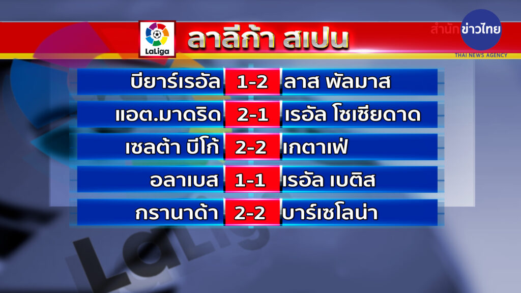 ลาลีกา สเปน บียาร์เรอัล แพ้ ลาส พัลมาส 1-2, แอต.มาดริด ชนะ เรอัล โซเซียดาด 2-1, เซลตา บีโก เสมอ เกตาเฟ 2-2, อลาเบส เสมอ เรอัล เบติส 1-1 และ กรานาดา เสมอ บาร์เซโลนา 2-2