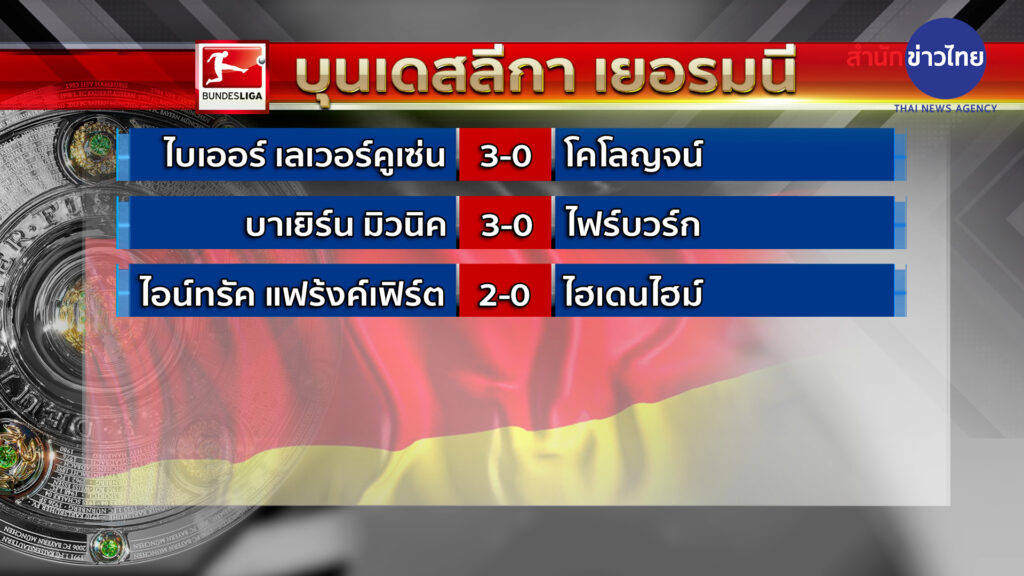 ฟุตบอลบุนเดสลีกา เยอรมนี “ห้างขายยา” ไบเออร์ เลเวอร์คูเซน เปิดสนามไบ อารีนา พบ “แพะบ้า” เอฟซีโคโลญจน์ นาทีที่ 32 เจ้าถิ่นได้ประตูนำก่อน 1-0 จากการยิงของ โยนาส ฮอฟมันน์ ก่อนที่ เยเรมี ฟริมปง จะมายิงประตูให้ทีมนำ 2-0 ครึ่งหลัง นาทีที่ 68 เลเวอร์คูเซน หนีห่างเป็น 3-0 โยนาส ฮอฟมันน์ จ่ายบอลให้ วิคเตอร์ โบนิเฟซ ยิงเข้าไป จบเกม เลเวอร์คูเซน เปิดบ้านชนะ โคโลญจน์ 3-0 เก็บชัยชนะ 3 นัดติดต่อกัน มีเพิ่มเป็น 19 คะแนน จาก 7 นัด ขึ้นนำจ่าฝูง โดยมีแต้มนำ สตุตการ์ด 1 คะแนน