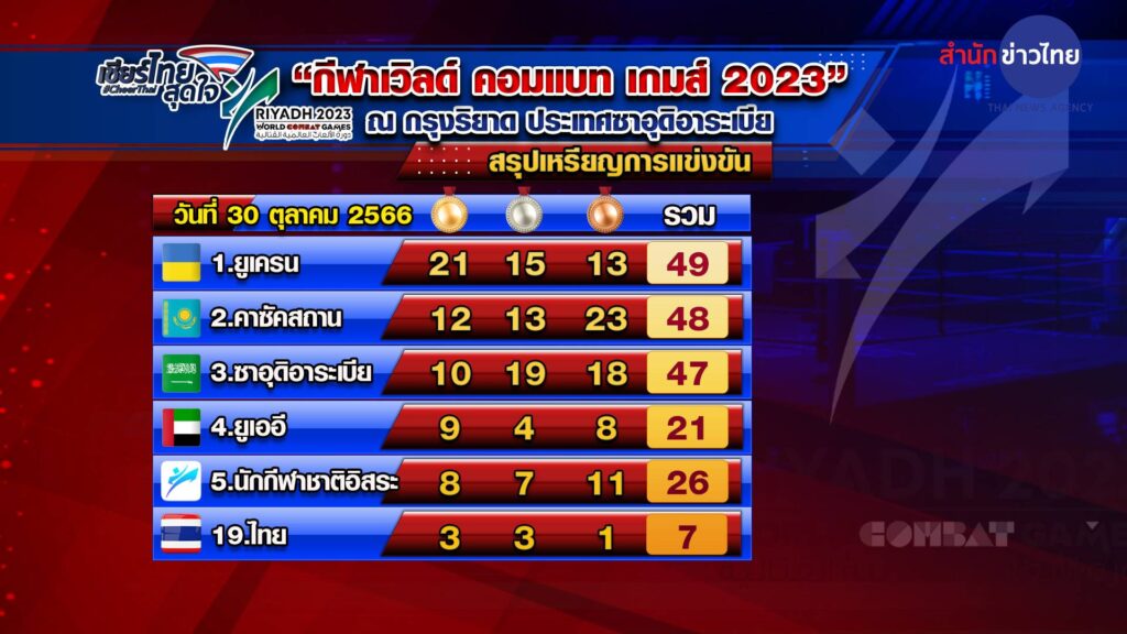ซาอุฯ 30 ต.ค.-“เวิลด์คอมแบทเกมส์ ริยาด 2023” ที่ซาอุดีอาระเบีย เมื่อคืนที่ผ่านมา ทีมมวยไทย ขึ้นชก 4 รุ่น เข้าชิงทั้ง 4 รุ่น