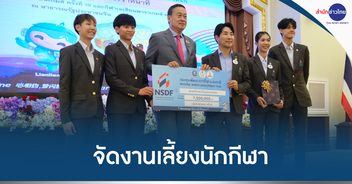 กทม. 7 พ.ย.-รัฐบาลไทย จัดงานเลี้ยงฉลองชัยความสำเร็จทัพนักกีฬาไทยชุดเอเชียนเกมส์ ครั้งที่ 19 และเอเชียนพาราเกมส์ ครั้งที่ 4 ณ เมืองหางโจว ประเทศจีน พร้อมมอบเงินรางวัลอัดฉีดจากกองทุนพัฒนาการกีฬาแห่งชาติ (NSDF) รวมทั้งสิ้น 353,925,000 บาท