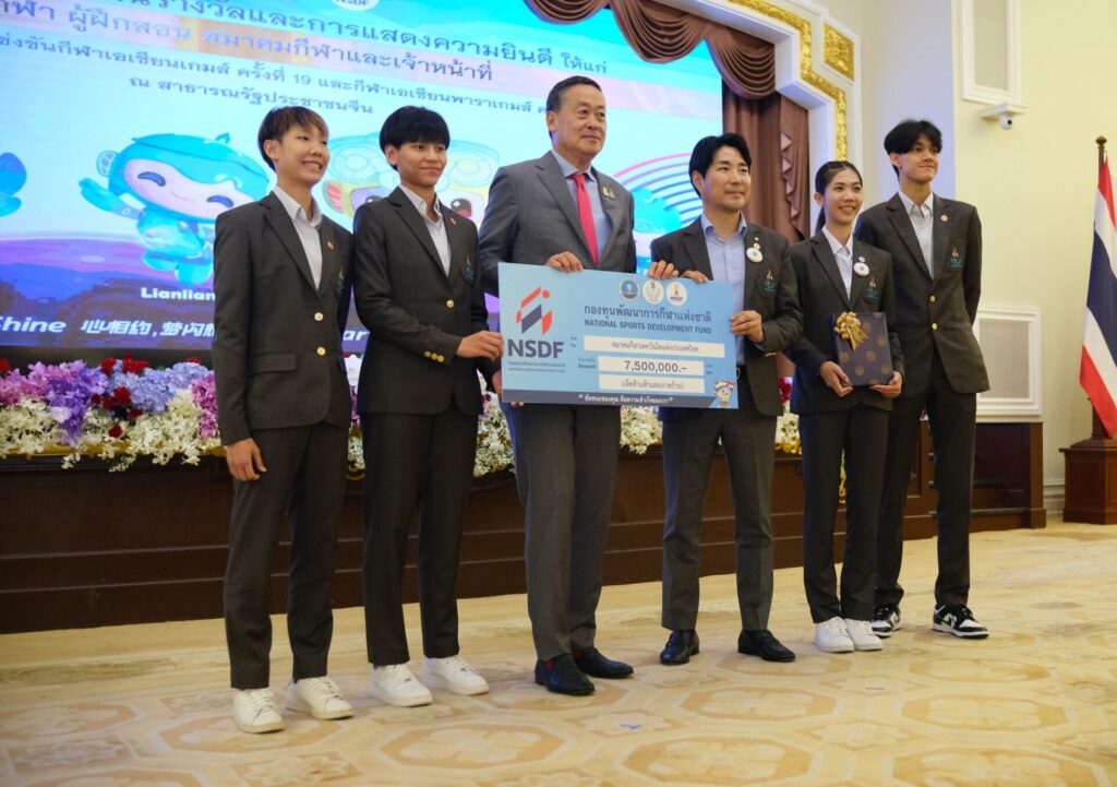 เมื่อวันที่ 7 พฤศจิกายน 2566 ณ ตึกสันติไมตรี ทำเนียบรัฐบาล นายเศรษฐา ทวีสิน นายกรัฐมนตรีและรัฐมนตรีว่าการกระทรวงการคลัง เป็นประธานในงานเลี้ยงฉลองชัยมอบเงินรางวัล และแสดงความยินดีให้แก่ นักกีฬา ผู้ฝึกสอน สมาคมกีฬา และคณะเจ้าหน้าที่ ชุดเข้าร่วมการแข่งขันกีฬาเอเชี่ยนเกมส์ ครั้งที่ 19 และกีฬาเอเชี่ยนพาราเกมส์ ครั้งที่ 4 ณ เมืองหางโจว ประเทศจีน โดยมี นายปานปรีย์ พหิทธานุกร รองนายกรัฐมนตรี, นายณณัฐ หงส์ชูเวช ที่ปรึกษารัฐมนตรีว่าการกระทวงการท่องเที่ยวและกีฬา, นายกิตติ เชาวน์ดี เลขานุการรัฐมนตรีว่าการกระทรวงการท่องเที่ยวและกีฬา, นายอารัญ บุญชัย ปลัดกระทรวงการท่องเที่ยวและกีฬา, ดร.ก้องศักด ยอดมณี ผู้ว่าการการกีฬาแห่งประเทศไทย (กกท.) และ ดร.สุปราณี คุปตาสา ผู้จัดการกองทุนพัฒนาการกีฬาแห่งชาติ (NSDF) เข้าร่วมงานด้วย