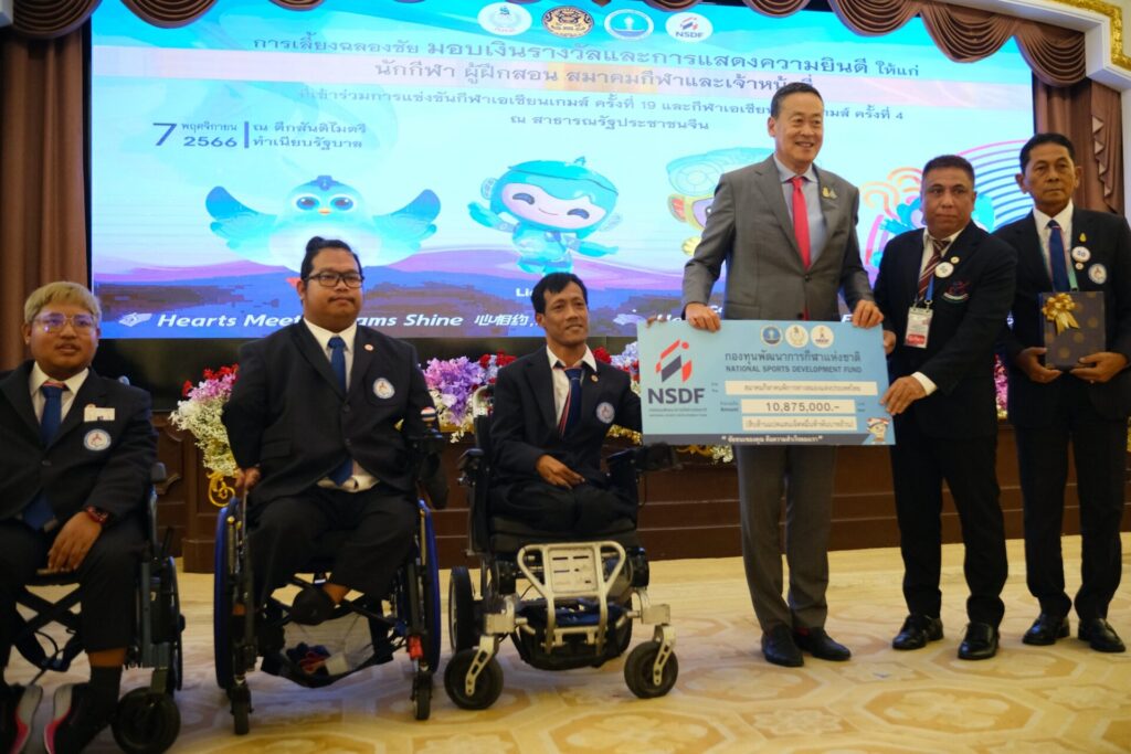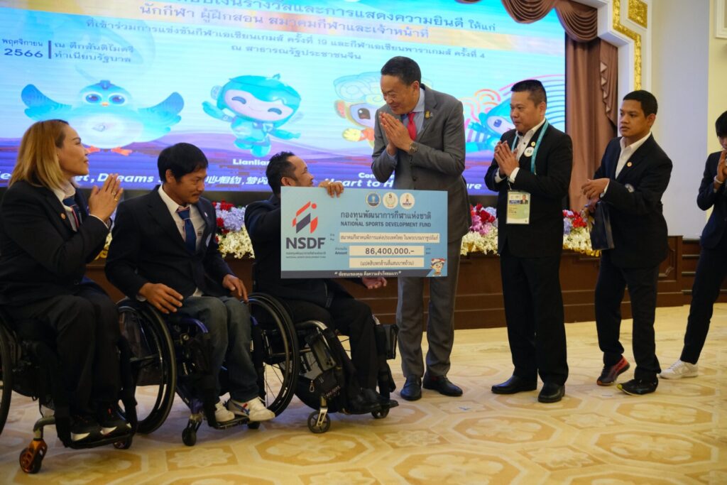 ขณะที่ทัพนักกีฬาคนพิการทีมชาติไทย ทำผลงานในกีฬาเอเชี่ยนพาราเกมส์ ครั้งที่ 4 คว้ามาได้ 27 เหรียญทอง 26 เหรียญเงิน 55 เหรียญทองแดง โดยตามหลักเกณฑ์ของกองทุนพัฒนาการกีฬาแห่งชาติ จะได้รับเงินรางวัล เหรียญทองละ 1 ล้านบาท, เหรียญเงินละ 500,000 บาท และเหรียญทองแดงละ 250,000 บาท สรุปเหรียญรางวัลของนักกีฬาคนพิการ ผู้ฝึกสอน และสมาคมกีฬา ได้รับเงินรางวัลรวมทั้งสิ้น 109,725,000 บาท แบ่งแยกตามแต่ละสมาคมกีฬา ดังนี้