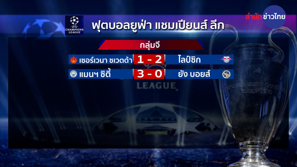 ผลฟุตบอล ยูฟ่า แชมเปียนส์ ลีก รอบแบ่งกลุ่ม กลุ่มจี “เรือใบสีฟ้า” แมนเชสเตอร์ ซิตี แชมป์เก่า จากอังกฤษ เปิดเอติฮัด สเตเดียม เอาชนะ ยัง บอยส์ จากสวิตเซอร์แลนด์ 3-0 ได้ประตู จากจุดโทษของ เออร์ลิง ฮาลันด์ ในนาทีที่ 23, ฟิล โฟเดน นาทีที่ 45+1 ก่อนที่ ฮาลันด์ จะมายิงประตูที่ 2 ของตนเอง ในนาทีที่ 51 ขณะที่ทีมเยือน ต้องเหลือผู้เล่นแค่ 10 จากการโดนไล่ออกของซานโดร เลาเปอร์ ในนาทีที่ 53 แมนฯ ซิตี้ เก็บชัยชนะ 4 เกมรวด มี 12 คะแนนเต็ม นำเป็นจ่าฝูง ผ่านเข้าสู่รอบ 16 ทีมสุดท้ายแน่นอนแล้ว ส่วน ยัง บอยส์ มีแต้มเดียว รั้งอันดับสุดท้าย
