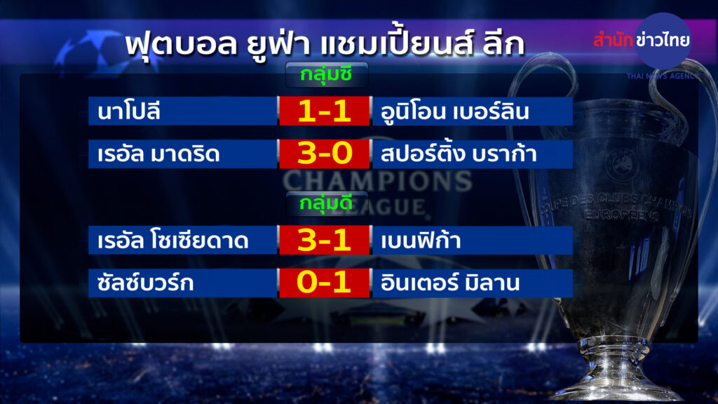 ผลอีกคู่ในกลุ่มเอ บาเยิร์น มิวนิค ชนะ กาลาตาซา ราย 2-1 มี 12 คะแนนเต็ม นำจ่าฝูง กลุ่มบี พีเอสวี ชนะ ล็องส์ 1-0 และ อาร์เซน่อล ชนะ เซบีย่า 2-0 กลุ่มซี นาโปลี เสมอ อูนิโอน เบอร์ลิน 1-1 และ เรอัล มาดริด ชนะ สปอร์ติ้ง บราก้า 3-0 / กลุ่มดี เรอัล โซเซียดาด ชนะ เบนฟิก้า 3-1และ ซัลซ์บวร์ก แพ้ อินเตอร์ มิลาน 0-1 .-สำนักข่าวไทย