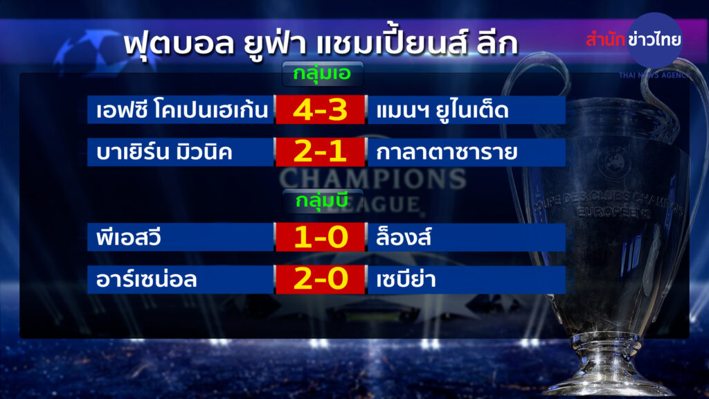 ผลฟุตบอล ยูฟ่า แชมเปียนส์ ลีก รอบแบ่งกลุ่ม กลุ่มเอ “ปีศาจแดง” แมนฯ ยูไนเต็ด จากอังกฤษ บุกไปแพ้ เอฟซี โคเปนเฮเกน จากเดนมาร์ก 3-4 โดยเกมนี้ แมนฯ ยูไนเต็ด ขึ้นนำก่อน 2-0 จากการยิงคนเดียว 2 ประตูของ ราสมุส ฮอยลุนด์ ในนาทีที่ 3 และ นาทีที่ 28 แต่นาทีที่ 42 แมนฯ ยูไนเต็ด ต้องเหลือผู้เล่น 10 คน เมื่อ มาร์คัส แรชฟอร์ด โดนใบแดงไล่ออกจากสนาม ก่อนที่ โมฮัมเหม็ด เอลยูนูสซี จะยิงให้เจ้าถิ่น ไล่มาเป็น 1-2 และ ดีเอโก กอนซัลเวส ยิงจุดโทษ ตีเสมอ ก่อนจบครึ่งแรก เสมอ 2-2