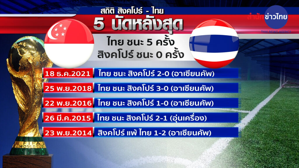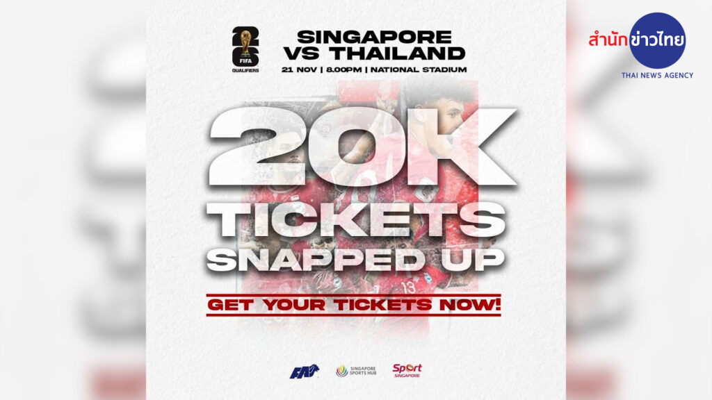 รายงานข่าวล่าสุดเวลานี้บัตรได้ถูกจำหน่ายไปแล้ว 25,000 ใบ จากความจุ 55,000 ที่นั่ง บัตรมี 2 ราคาคือ 25 เหรียญ คือ 650 บาท และ 10 เหรียญสิงคโปร์ คือ 260 บาท สำหรับสถิติการพบกัน 5 นัดหลัง ไทยชนะรวด และไม่แพ้สิงคโปร์มานาน 11 ปีแล้ว โดยนัดสุดท้ายที่ไทยแพ้ เกิดขึ้นเมื่อเดือนธันวาคมปี 2012 ที่แพ้ในรอบชิงแชมป์อาเซียน 1-3 .-สำนักข่าวไทย