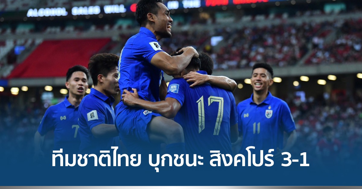 สิงคโปร์ 21 พ.ย. – ทีมชาติไทย บุกชนะ สิงคโปร์ 3-1 คว้าชัยการแข่งขันฟุตบอลโลก 2026 รอบคัดเลือก โซนเอเชีย รอบ 2 กลุ่มซี นัดที่ 2 เก็บ 3 แต้มแรก พร้อมขยับขึ้นอันดับ 2 ของกลุ่มซี
